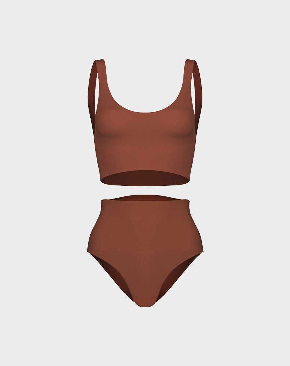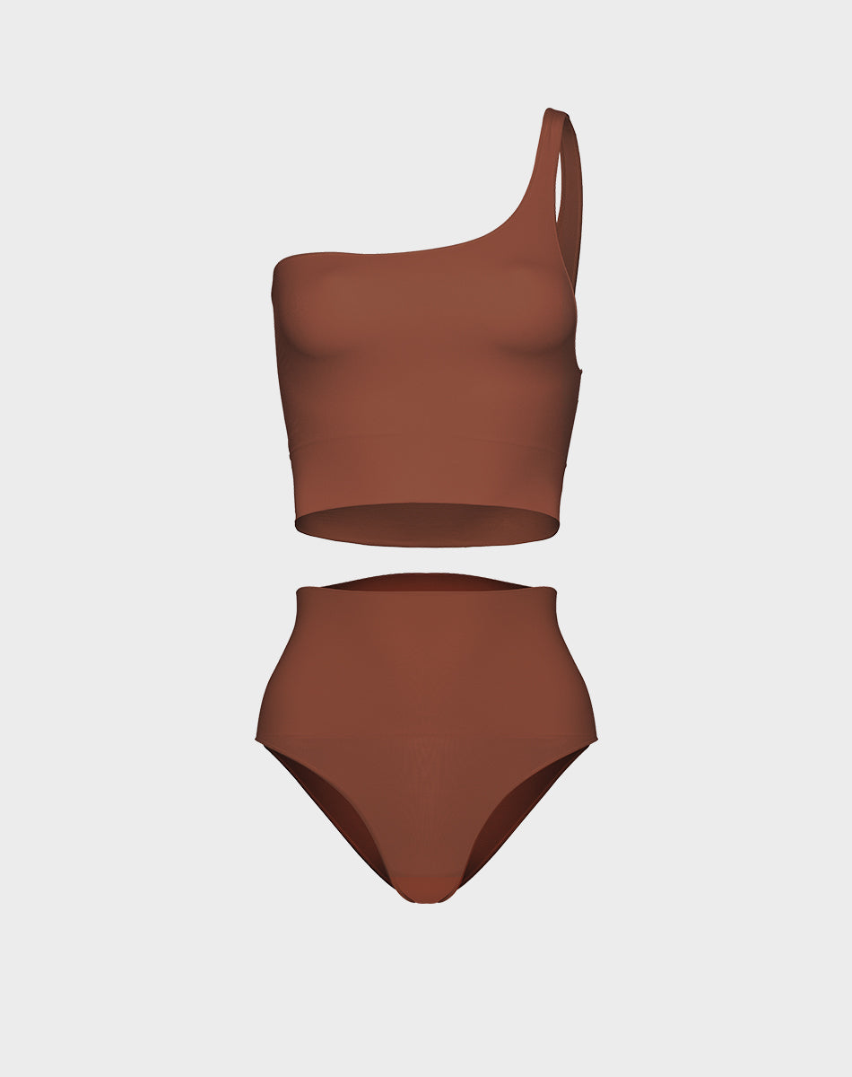 מארז טופ סימלס כתף אחת + תחתון מחטב סימלס גזרה גבוהה | חום